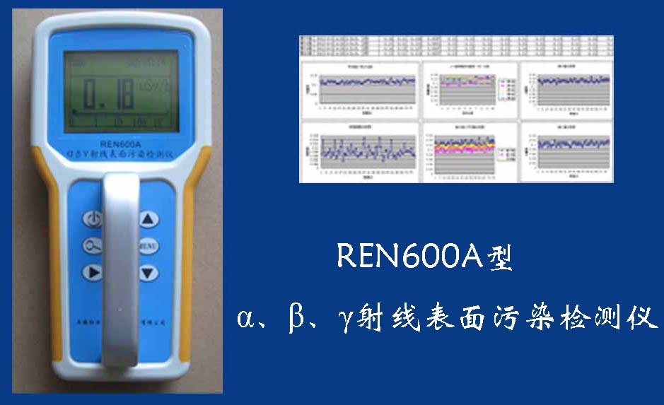 • REN600A 表面沾污檢測(cè)儀REN600A型α、β、γ射線表面污染檢測(cè)儀即可檢測(cè)α、β、γ射線,也能檢測(cè)到X射線,它采用高速嵌入式微處器作為數(shù)據(jù)處理單元,點(diǎn)陣式大屏幕LCD液晶顯示,讀數(shù)清晰、操作方便,具有400條超大容量數(shù)據(jù)存儲(chǔ)。儀器采用進(jìn)口的大面積MICA蓋革探測(cè)器,具有較高探測(cè)效率,可進(jìn)行α、β輻射表面污染檢測(cè)和X、γ輻射劑量率的監(jiān)測(cè)。此外通過(guò)配套的RenriCont表面污染管理軟件可將存儲(chǔ)的數(shù)據(jù)讀出后分析。可廣泛用在制藥廠、實(shí)驗(yàn)室、發(fā)電廠、進(jìn)出口商檢、采石場(chǎng)、環(huán)境實(shí)驗(yàn)室、環(huán)境污染調(diào)查、核安全應(yīng)急、緊急狀況營(yíng)救站、金屬處理廠、地下油田、供油管道裝備、醫(yī)院核醫(yī)學(xué)科、同位素實(shí)驗(yàn)室、環(huán)境保護(hù)和警察局等部門(mén)。REN600A型α、β、γ射線表面